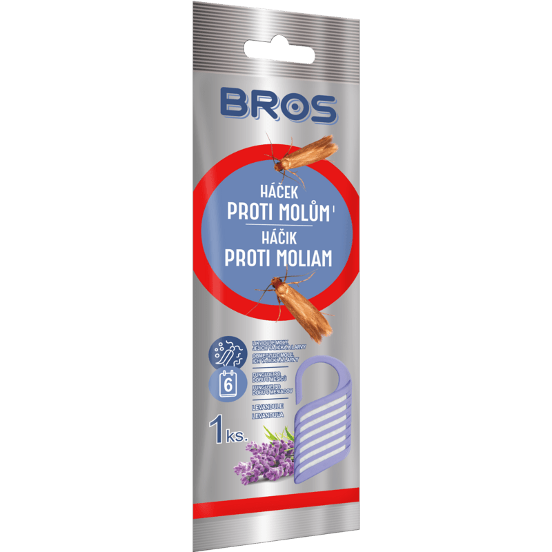 Závěsný háček proti molům BROS vhodný k zavěšení do skříně mezi oblečení, s vůní levandule. Účinně hubí moly (dospělé, vajíčka i larvy). Ochrání oblečení po dobu 6 měsíců. Použití – odstraňte obal a položte nebo zavěste na požadované místo. Jeden háček působí na 1m3.