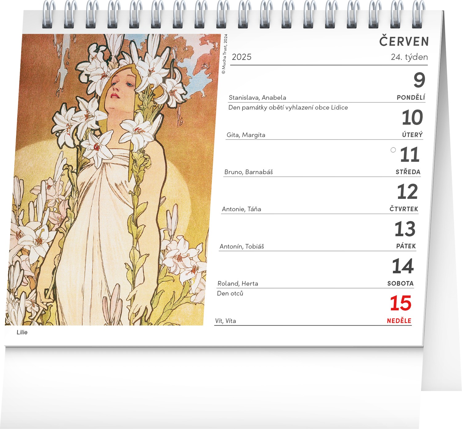Průřez tvorbou Alfonse Muchy zobrazený na 53 reprodukcích secesního malíře a designéra, který se proslavil tvorbou plakátů pro divadelní představení. Nestárnoucí plakáty se Sarah Bernhardt, série květin či ročních dob vám bude dělat radost celý rok. Týdenní kalendárium obsahuje česká jména, svátky a památné dny, fáze měsíce a přehled na rok. Rozměr: 165 x 130 mm Vazba: dvojitá spirála s háčkem Počet stran: české – týdenní / 30 listů (oboustranný tisk) Gramáž: 100 g/m2 Prostor pro přítisk: 2,9 x 16,5 cm