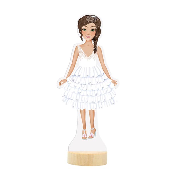 Balení obsahuje oblékací postavičku, 3 archy magnetických částí oblečení, bot a doplňků a dřevěný podstavec.