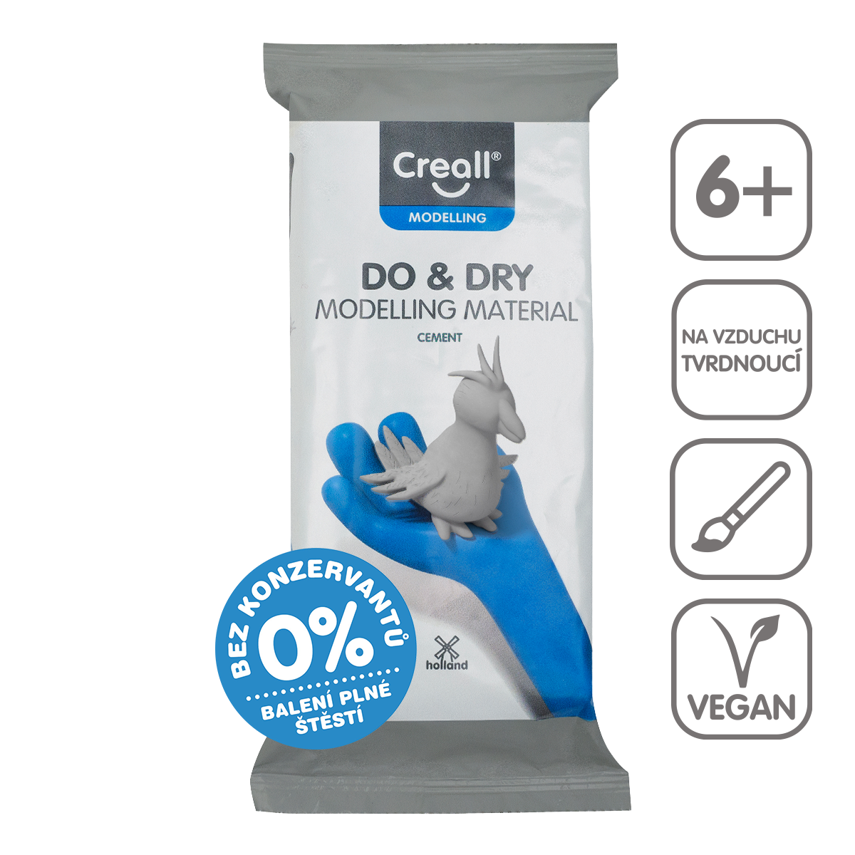 Modelovací hmoty řady Creall Modelling jsou vhodné pro děti, nadšence i profesionály. U dětí navíc pomáhají rozvíjet jemnou motoriku a kreativitu. Jemná a lehce zpracovatelná modelovací hmota nahrazuje přírodní materiály bez nutnosti vypalování v peci. Po vytvrdnutí (24 hodin) lze lakovat nebo dekorovat například akrylovými barvami Molenaer. Nelepí se na ruce a po navlhčení je znovu tvarovatelná. Díky jemné struktuře je vhodná i pro práci s detaily. 98 % přírodních složek, neobsahuje konzervanty ani lepek hypoalergenní bez zápachu není potřeba vypalovat, po navlhčení obnovitelná barva: šedý cement pro děti od 6 let vyrobeno v Holandsku obsah balení: 1 ks Záruční doba: 24 měsíců Výrobce/Dovozce do EU: Havo b.v.