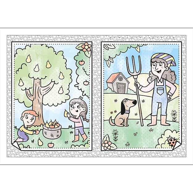 Omalovánky obsahují 8 kouzelných obrázku, k jejichž vybarvení stací detem pouze štetec a pár kapek vody. Stránky obsahují barevné tecky, které po rozetrení obrázek probarví.